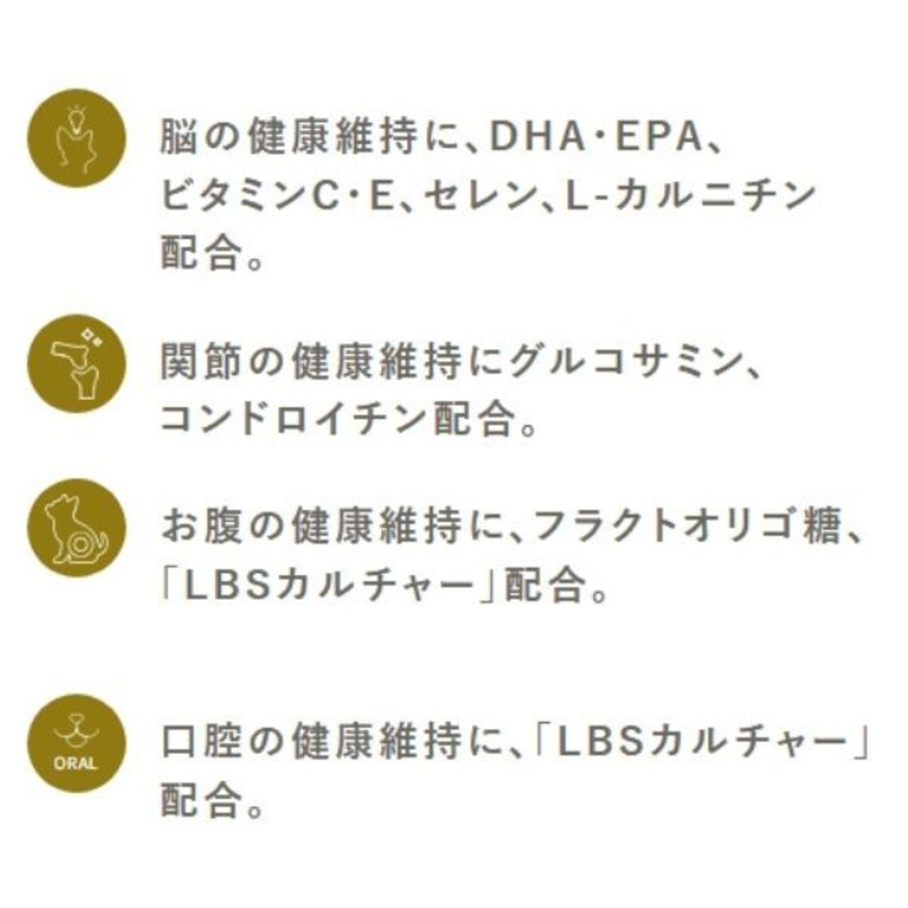 穀類(とうもろこし、小麦粉)、豆類(脱脂大豆、おから)、油脂類(動物性油脂、フィッシュオイル:DHA・EPA源、米胚芽油)、肉類(ミートミール、チキンミール、チキンレバーパウダー)、セルロース、魚介類(フィッシュミール)、糖類(フラクトオリゴ糖)、軟骨抽出物:コンドロイチン源、L-カルニチンフマル酸塩、共棲発酵エキス(乳酸菌、納豆菌、酵母菌)、シャンピニオンエキス、グルコサミン、セレン酵母、ビタミン類(A、D3、E、K3、B1、B2、パントテン酸、ナイアシン、B6、葉酸、ビオチン、B12、C、コリン)、ミネラル類(カルシウム、リン、ナトリウム、塩素、鉄、コバルト、銅、マンガン、亜鉛アミノ酸複合体、亜鉛、ヨウ素)、アミノ酸類(メチオニン、タウリン)、酸化防止剤(ガンマ-オリザノール、ローズマリー抽出物、ミックストコフェロール)