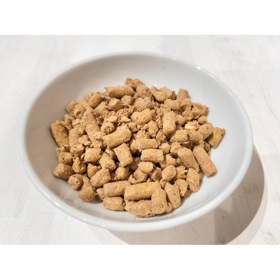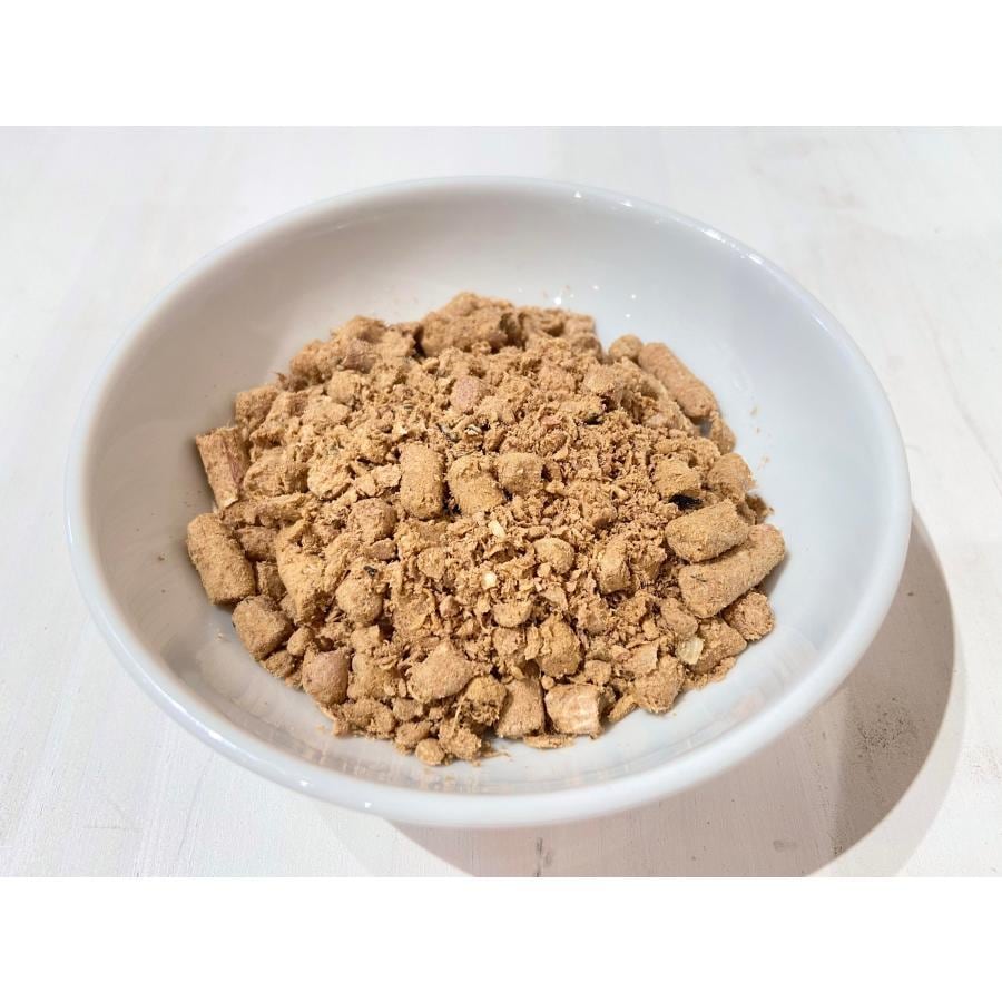フィーラインナチュラルは、原材料の98%以上に自然食材を使用し、その栄養や風味を最大限に生かすため、原材料の加工・加熱を最小限に抑えた特殊なフリーズドライ製法を採用しています。そのため、原材料の収穫時期やサプライヤー(供給元)の違い、季節による家畜・家禽の脂肪分の違いなど、素材の特長がそのまま、粒に反映されるため、保証成分値の範囲内ではありますが、粒の形状や、硬さ、色や香りなど、違いがあります。また、一般的なドライフードのように、肉食動物である猫にとって不要な、穀類・イモ類・豆類などの、粘性の高いツナギや量増しとしての原材料を一切使用していないため、1粒1粒が柔らかく、簡単に、ほぐせるようになっています。フィーラインナチュラルは、基本的な与え方として、本来の食事に近づけるために、生食の水分値に戻してから与えていただくフードですので、粉状になっているものはそのまま、粒状のものはくずしてから、水かぬるま湯(37℃以下)を加えると、短い時間で、戻ります。