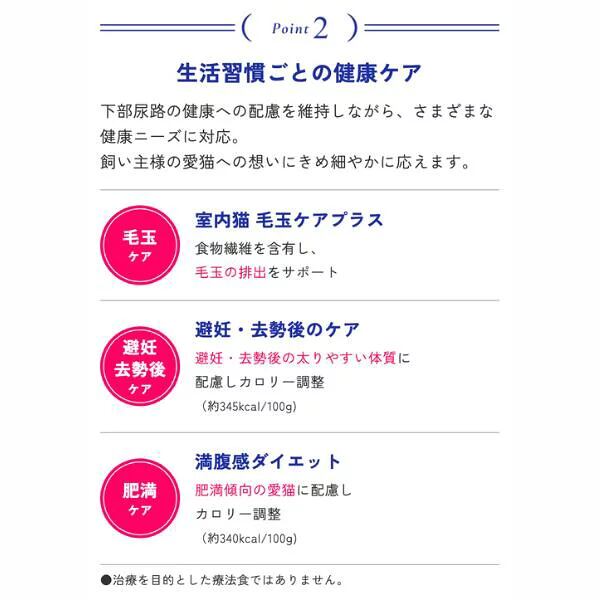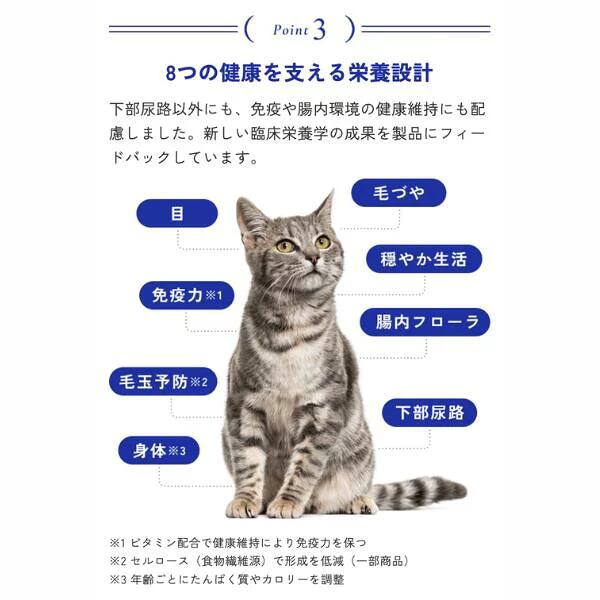 猫の臨床栄養学から生まれた下部尿路の健康維持フード。マグネシウムとカルシウムの適正バランス、尿pHのコントロールなど、成長段階にあった栄養設計をしています。