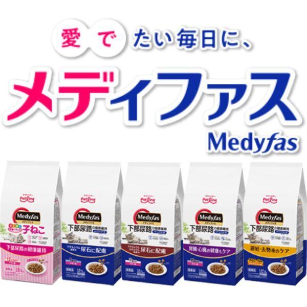 メディファスは、猫の年齢によってできやすい尿石が異なること、適切なミネラルバランスと尿pH値が変わることに着目。年齢ごとに栄養設計をキメ細かく分けています。