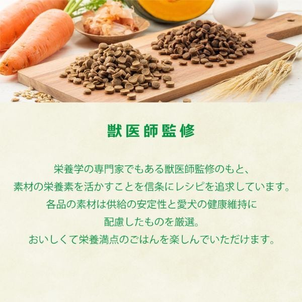 “獣医師監修のもと、素材の栄養素を生かした栄養満点のレシピでつくっています。愛犬の健康維持に配慮して素材を厳選。総合栄養食としてご利用いただけます。